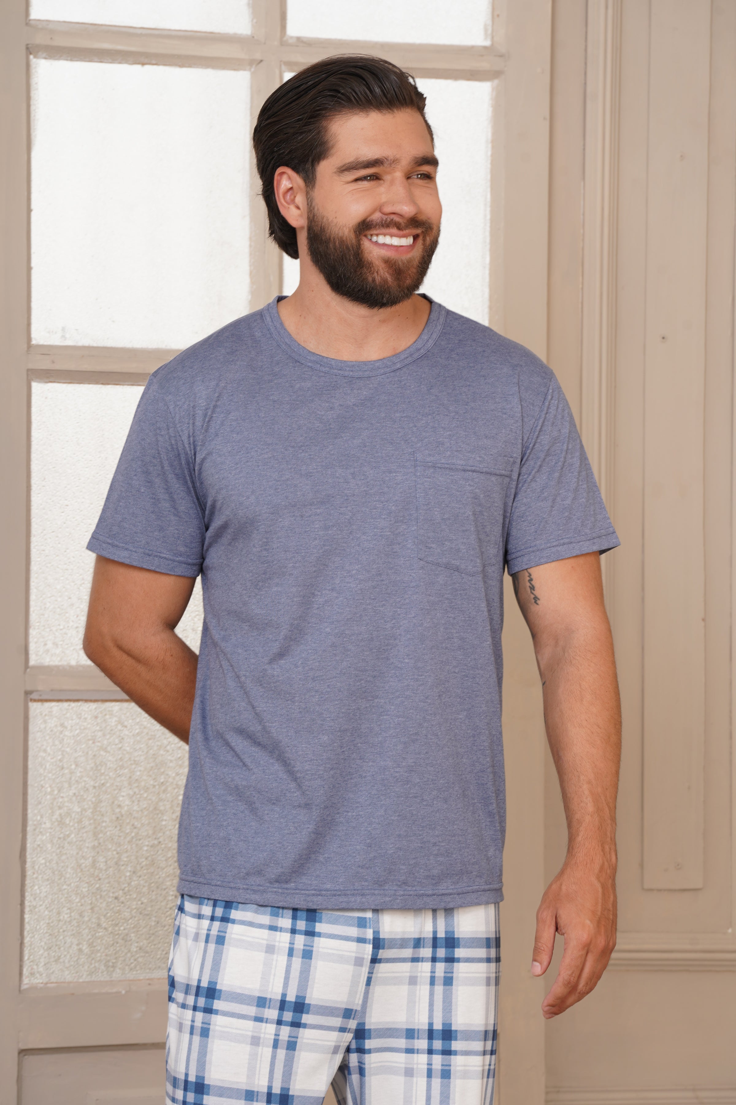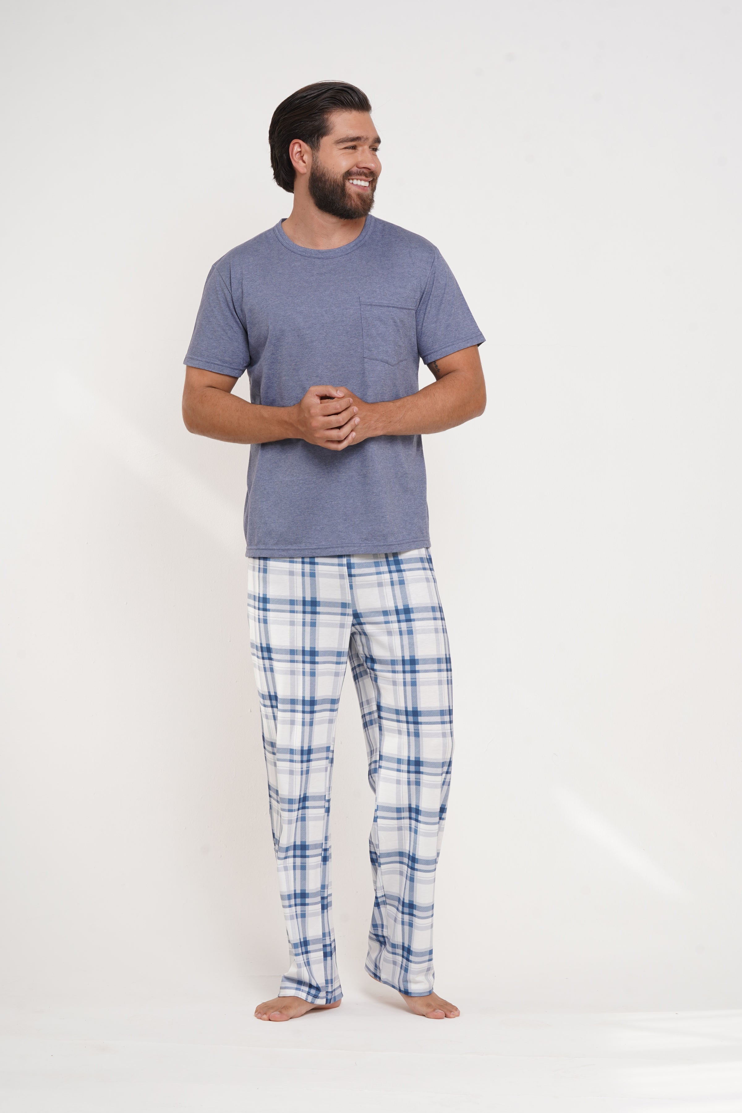 Pijama para Hombre en set de manga corta y pantalón a cuadros con bolsillo funcional. Color Azul Cross. Tela poliéster algodón.